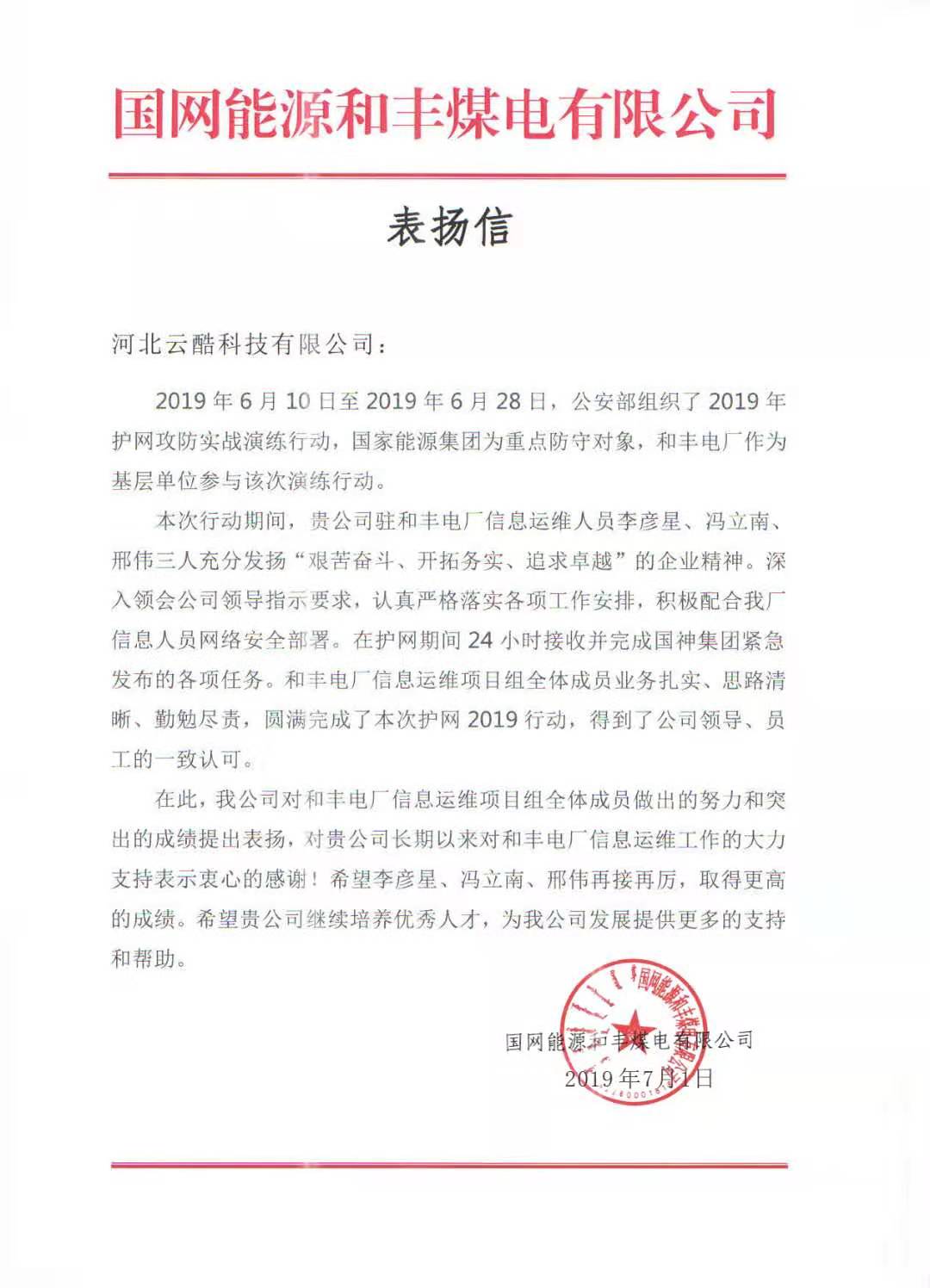 云酷科技運(yùn)維服務(wù)部的四位同事憑借優(yōu)異的技術(shù)實(shí)力和敬業(yè)精神,在本次的演練行動(dòng)中獲得某煤電有限公司的高度贊揚(yáng),并向我司發(fā)來(lái)了表?yè)P(yáng)信: